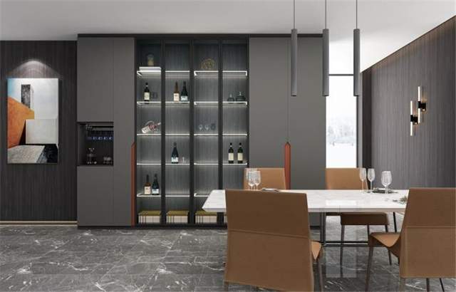 餐廳空間色調(diào)上延續(xù)了高級灰色調(diào)。摒棄所有不必要的繁復(fù)枝節(jié),保留最本質(zhì)的收納功能,讓人在其中倍感舒適和清爽。